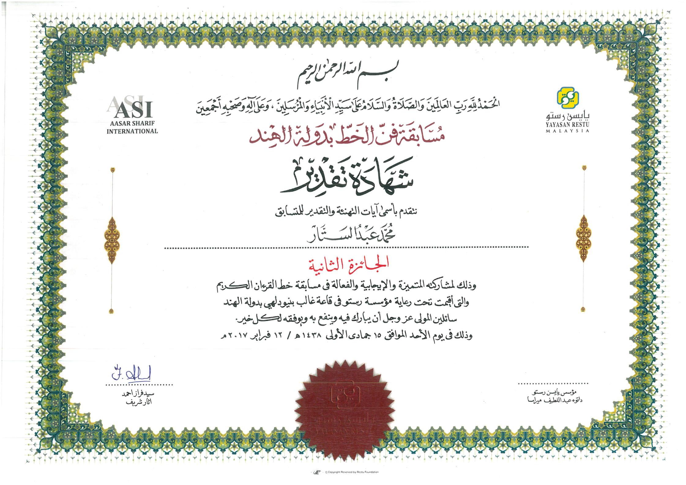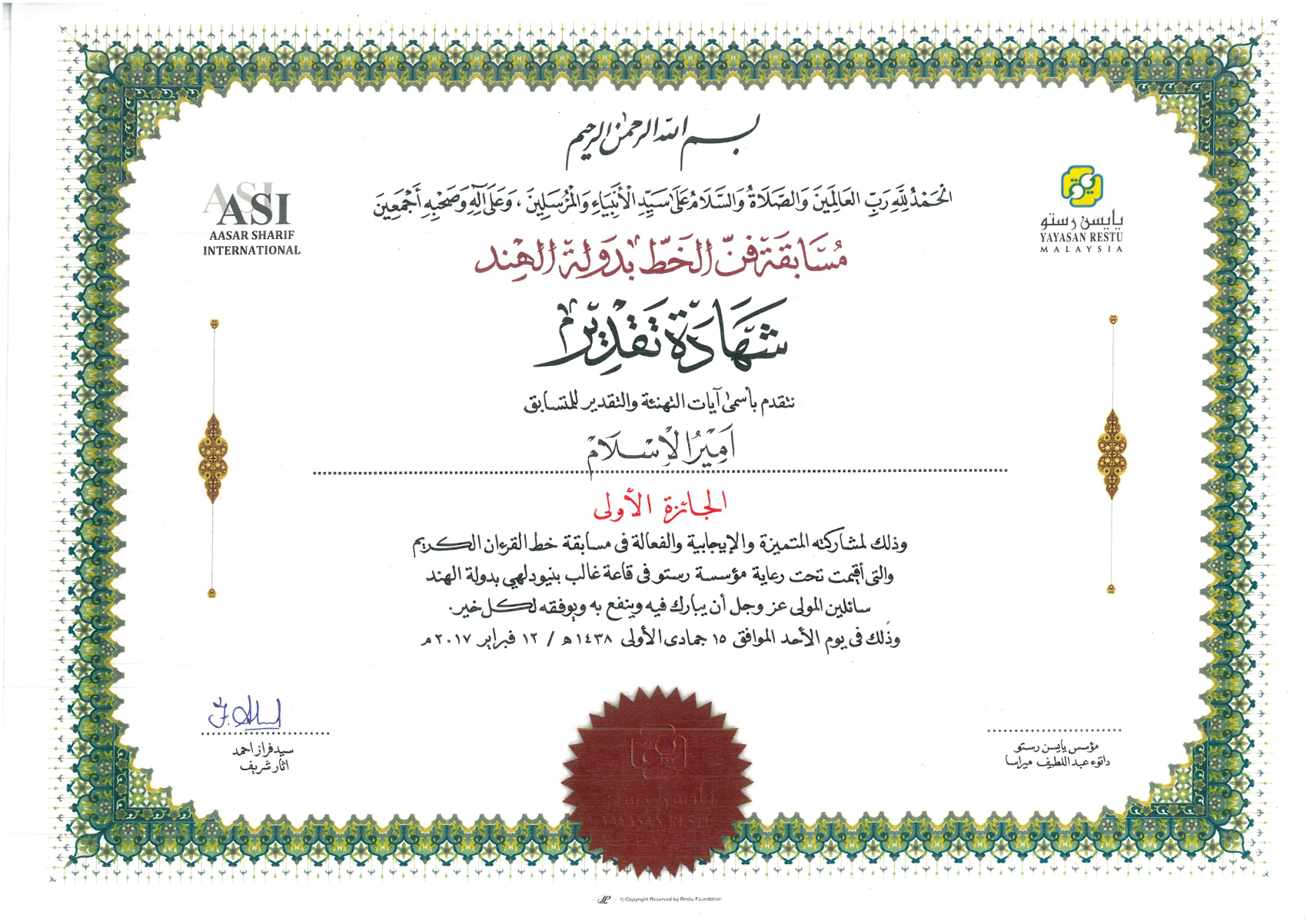 IIIAC Bangalore Won the All India Arabic Calligraphy Competition organized by Yayasan Restu Malaysia in New Delhi